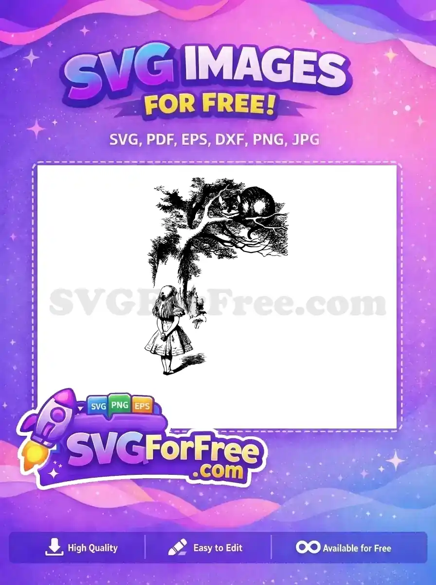 Discover this free design, a captivating Alice in Wonderland illustration with the iconic Cheshire Cat in a tree. Perfect for adding a touch of classic fantasy to your projects.