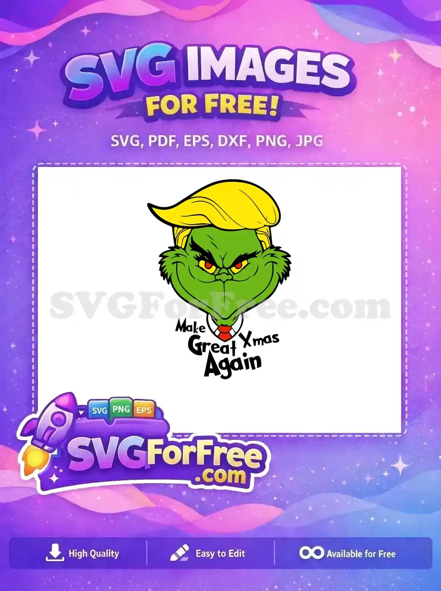The Grinch with yellow hair, parodying Donald Trump, with the text “Make Great Xmas Again”. A free humorous design.