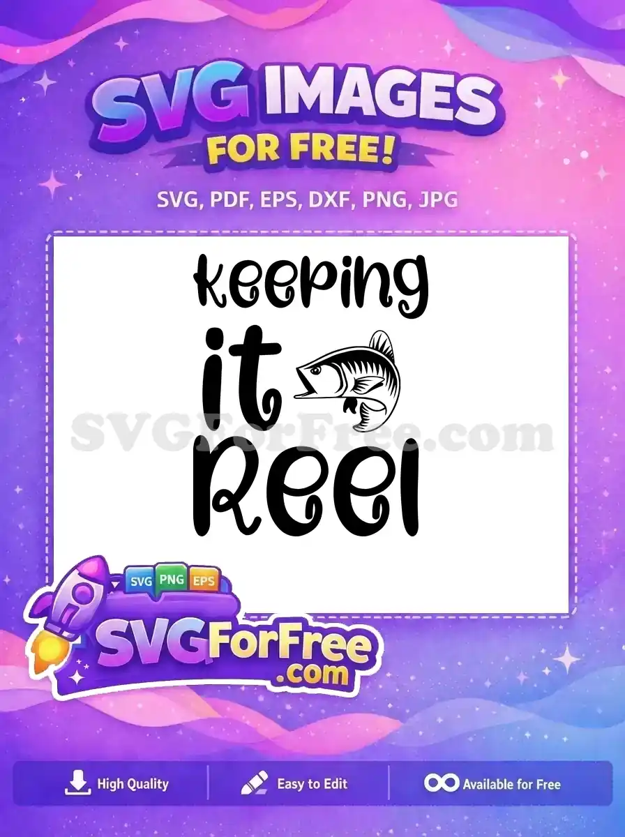 Stylized ‘Keeping it Reel’ typography with a leaping fish, available as a free artistic vector design.