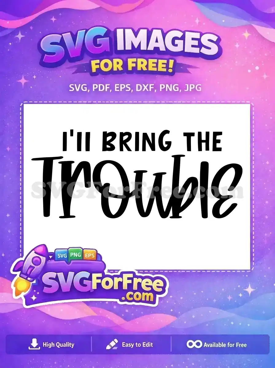 Playful text I’LL BRING THE TROUBLE, offered as a free SVG for kids.