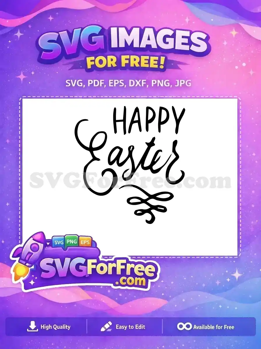 “Happy Easter” text stacked with flourishes, offered as a free-to-use vector design.