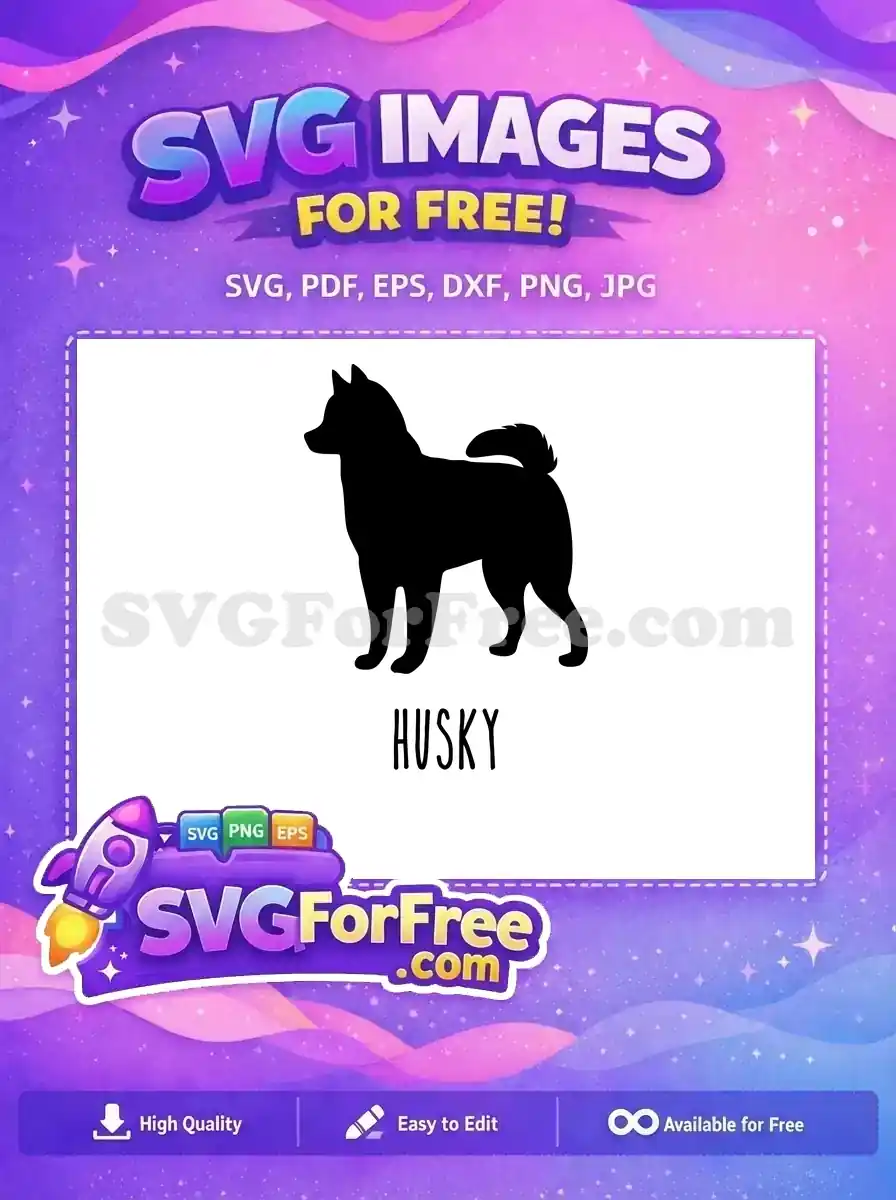 A striking silhouette of a Siberian Husky, featuring its characteristic pointy ears and curled tail. Free.