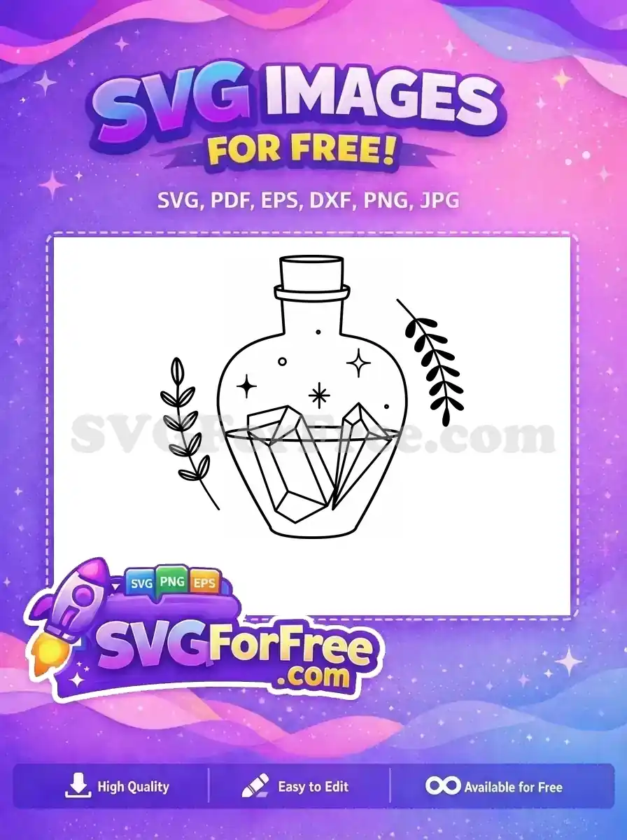 A free delicate line art graphic of a small bottle with crystals inside, adorned with leafy sprigs.