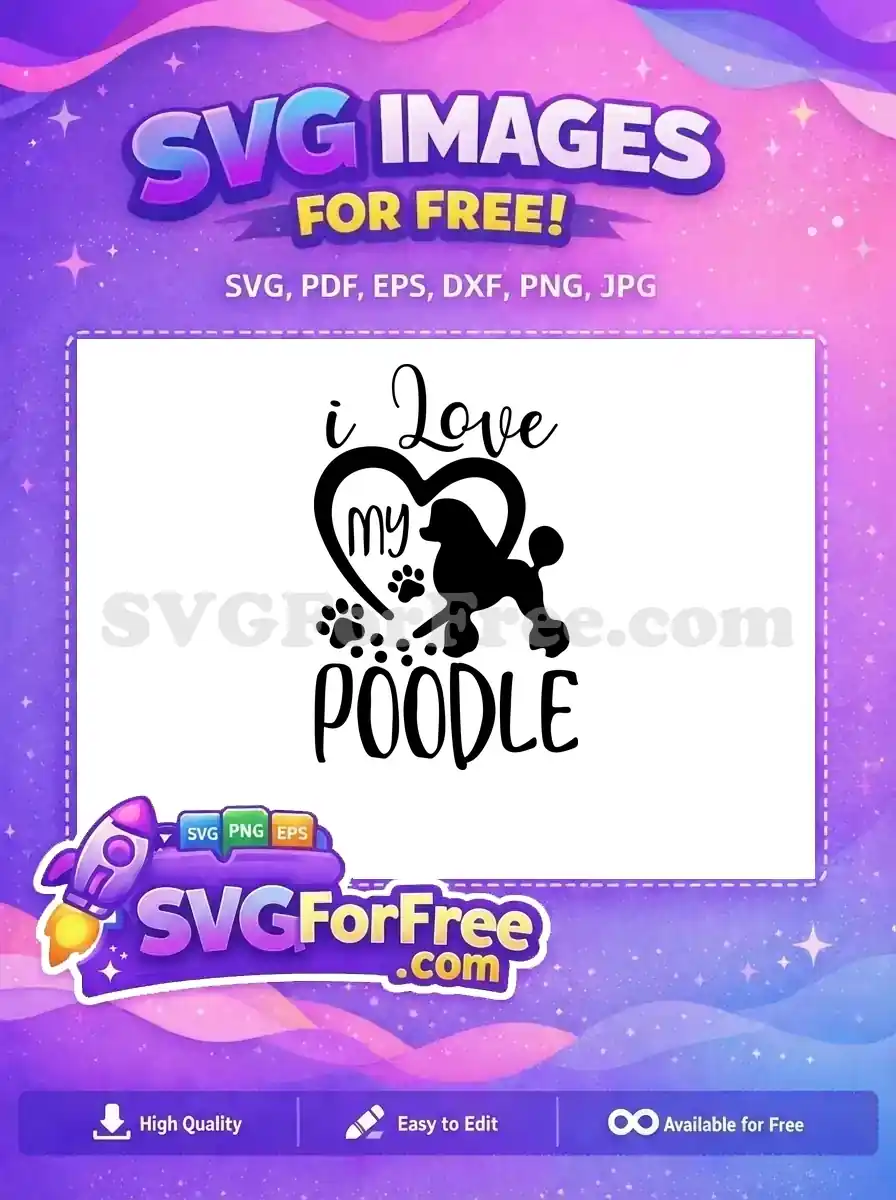 Stylized Poodle silhouette holding a heart balloon with ‘I Love my Poodle’ text, a free creative vector.