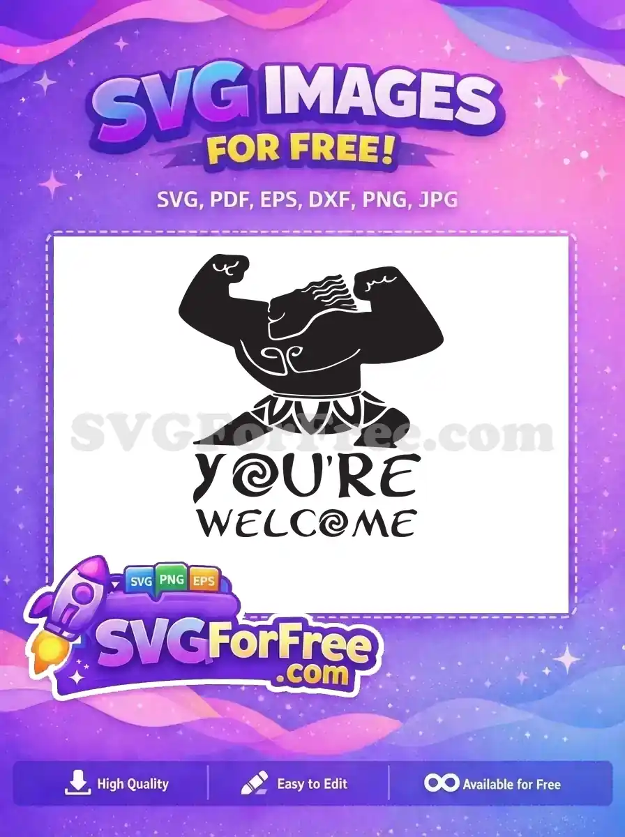 Maui’s muscular silhouette with his magical hook, featuring the famous line ‘YOU’RE WELCOME’ in bold text, free SVG.