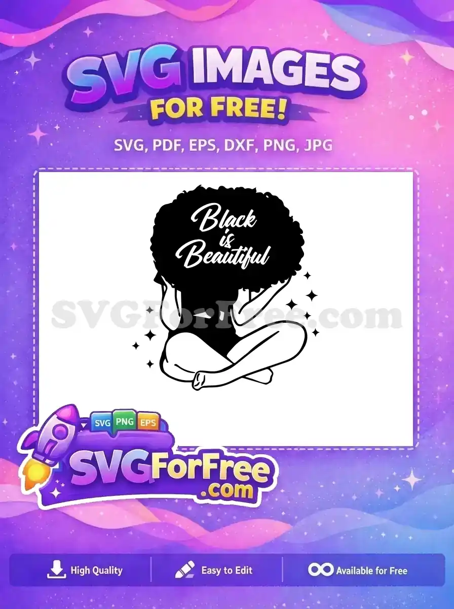A free line art version of a woman with a big afro sitting cross-legged, with ‘Black & Beautiful’ text.