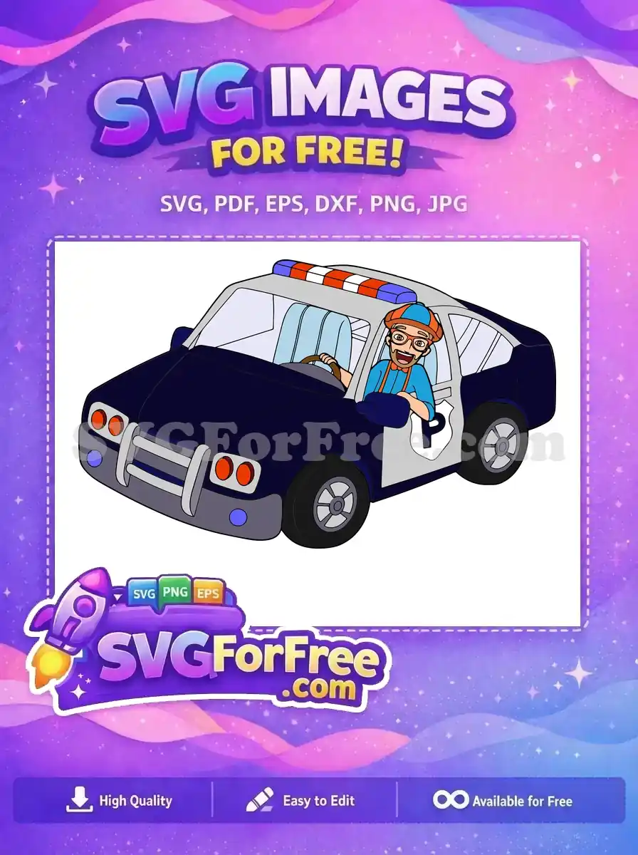 Grab this exciting free Blippi in a police car design, perfect for kids’ crafts! A vibrant, free SVG that brings joy to any project with its playful appeal.