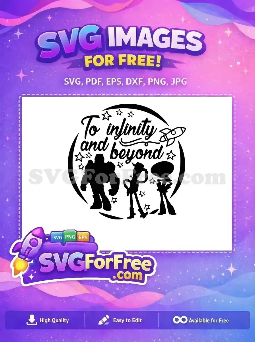 A circular design with ‘To infinity and beyond’ and silhouettes of Woody, Buzz, and Jessie. A free design.
