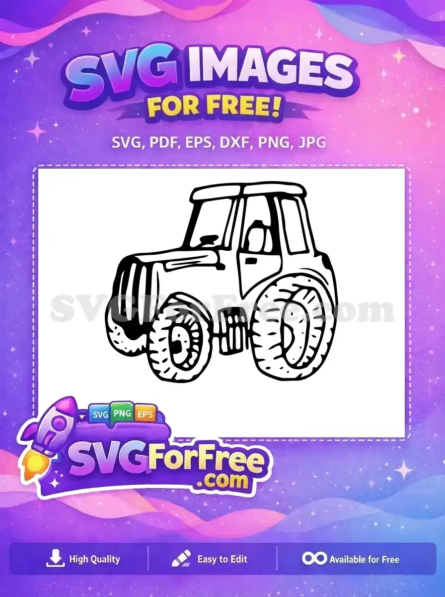 A clean, white-filled outline drawing of a classic tractor from a front-three-quarters view. A free design.