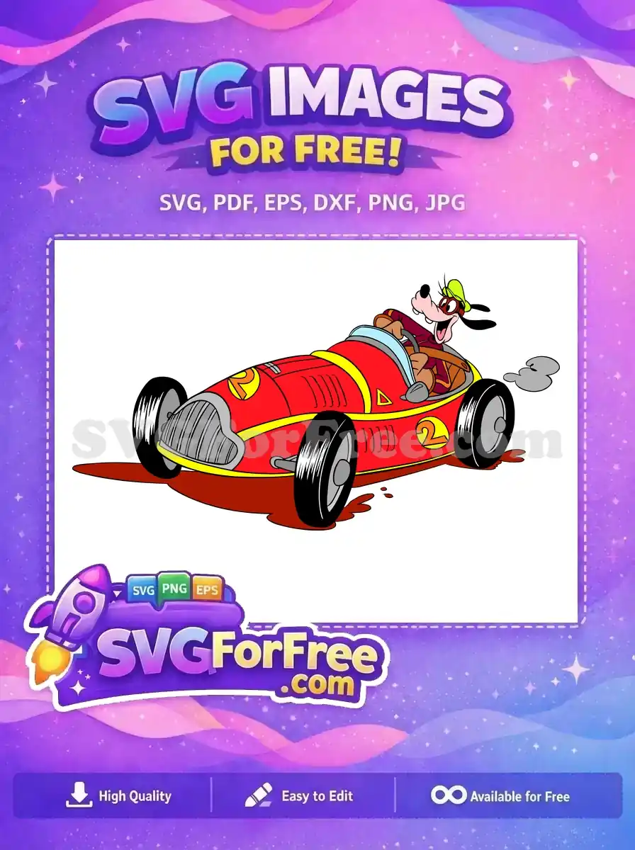 Grab this free design featuring Goofy racing in a vibrant vintage car! Perfect for fun, nostalgic projects. A truly iconic free SVG.