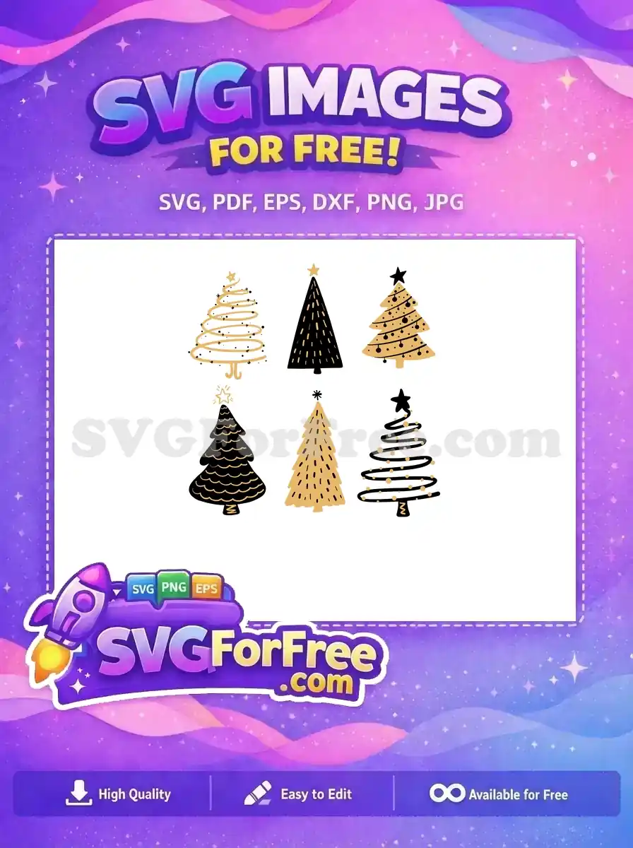 Collection of six minimalist patterned Christmas trees, available as a free graphic.