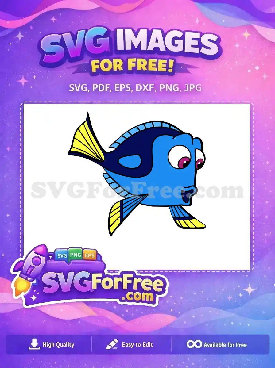 A side-profile view of Dory the blue tang fish swimming gracefully. A classic, free character design.