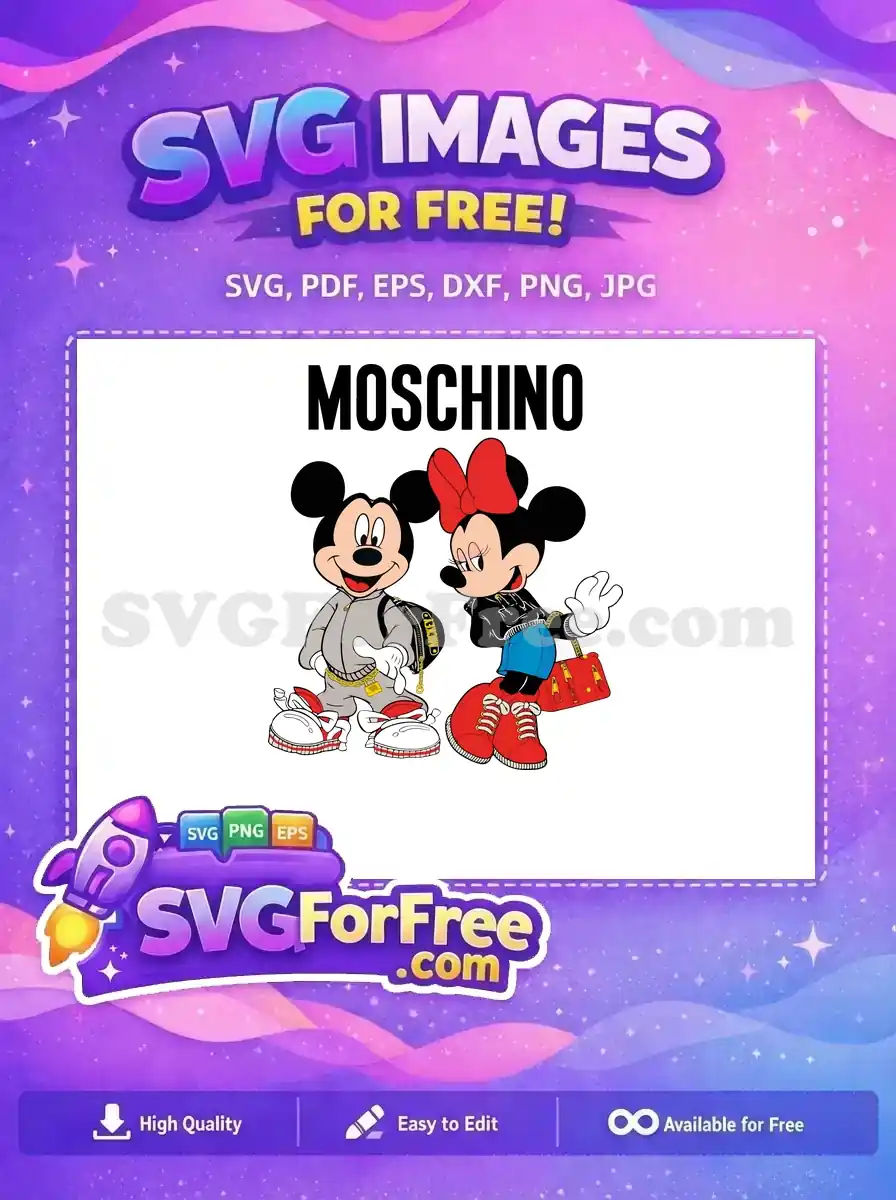 A fashion-inspired free design featuring Mickey and Minnie Mouse alongside the “MOSCHINO” brand name.
