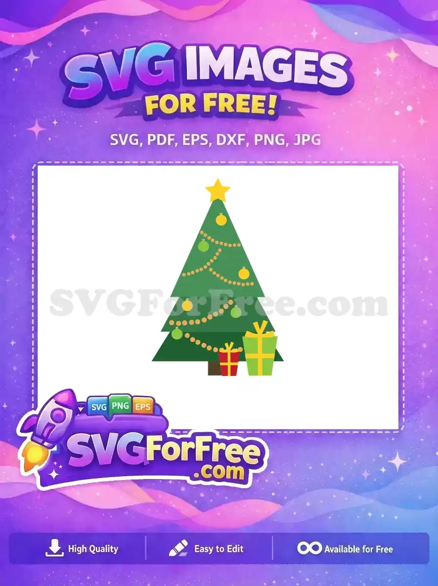 Decorated Christmas tree free vector with yellow garland, ornaments, and gifts.