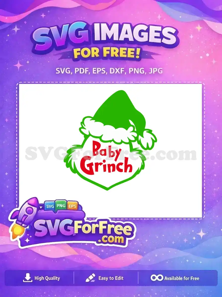 Mischievous ‘Baby Grinch’ text with a green furry hat, available as a free holiday character vector.