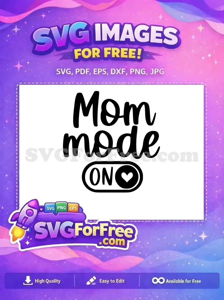 Bold ‘Mom mode’ text with an ‘ON’ button containing a heart, available as a free cut file.