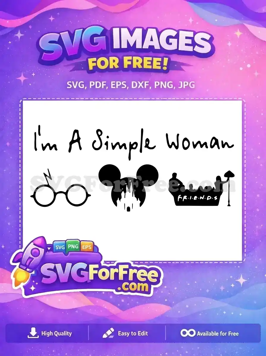 Icons: glasses, mouse ears, castle with ‘Simple Woman’ text, a free vector.