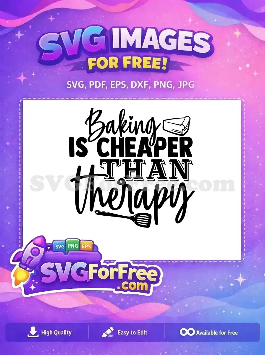 Get this free ‘Baking is Cheaper Than Therapy’ SVG design! Perfect for bakers, stress-relievers, and dessert lovers. A charming free design for creative projects.