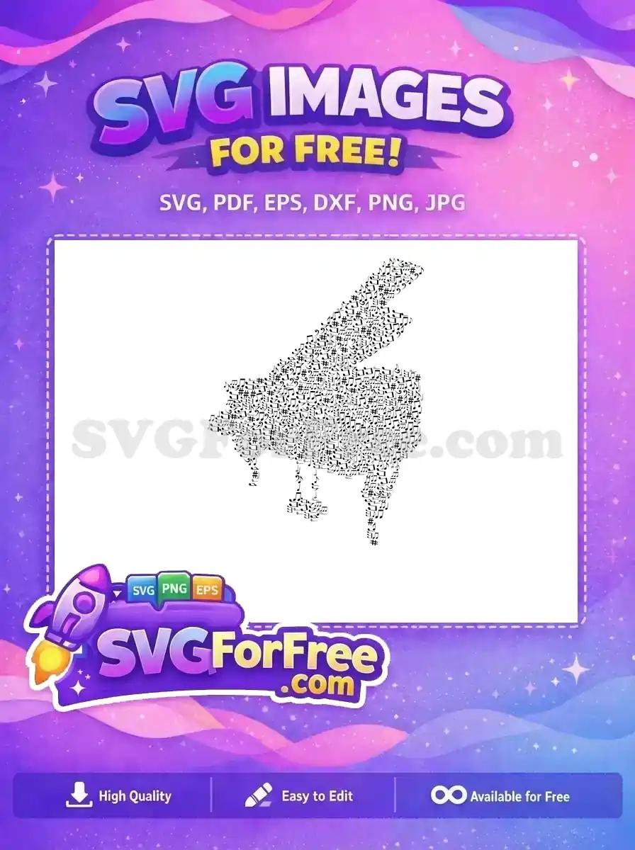 Grand piano silhouette intricately textured and composed of countless small black musical notes and symbols, free vector.