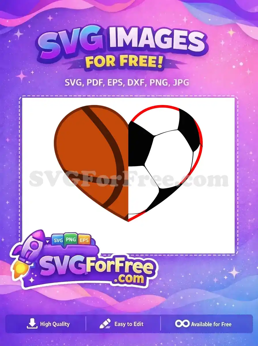 Heart shape split between basketball orange and soccer ball pattern, a free dual-sport svg.