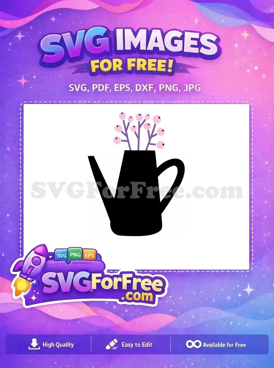 Black watering can silhouette with purple flowers, a colorful free vector for gardening themes.