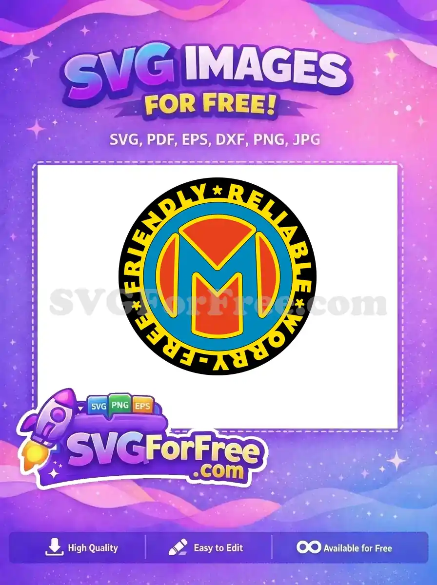 Circular ‘FRIENDLY RELIABLE’ badge with ‘M’ logo, a free superhero style vector.