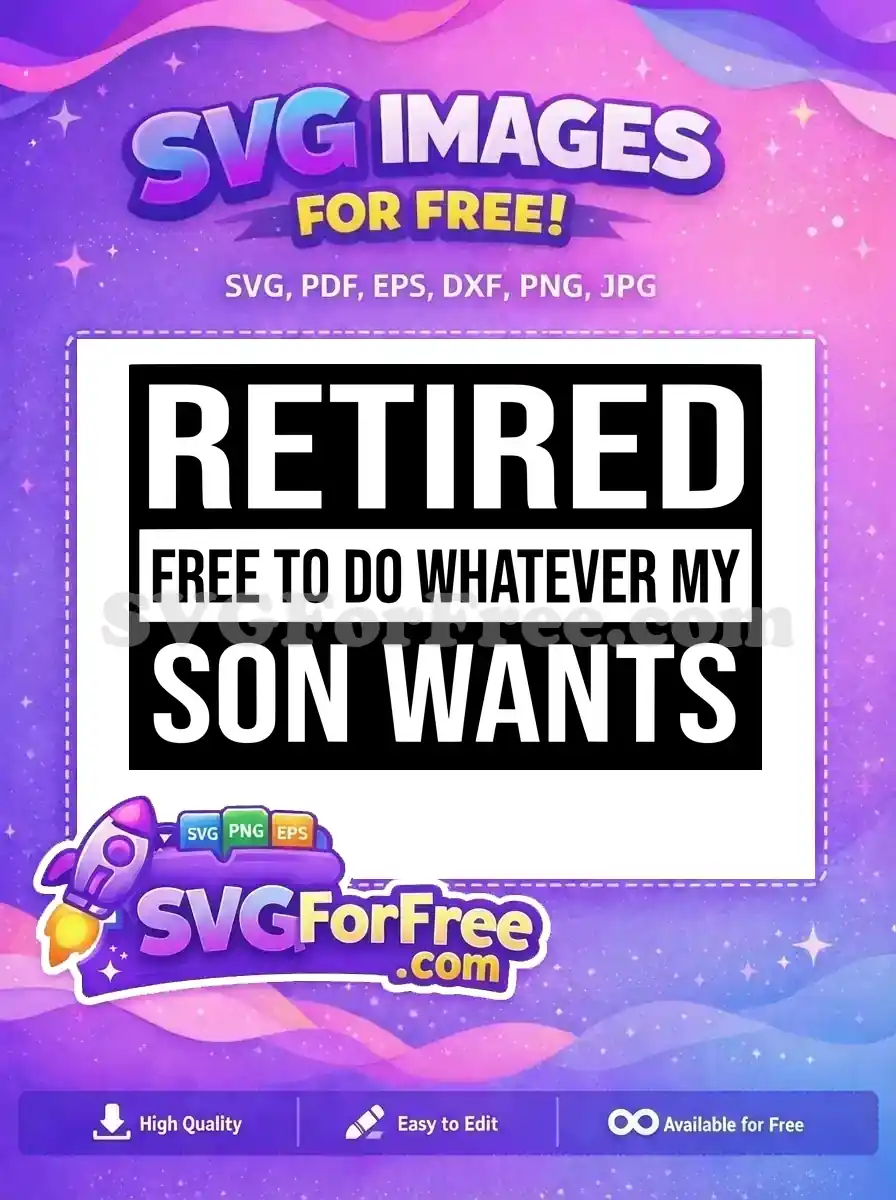Free graphic featuring the text ‘Retired Free To Do Whatever My Son Wants’ in a classic stamp box.