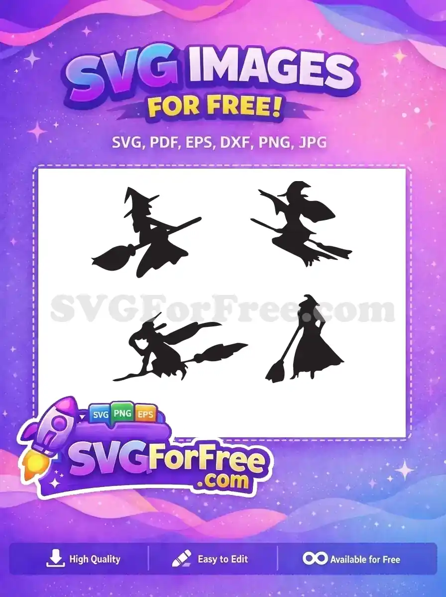 Set of three flying witch silhouettes on brooms, available as a free vector pattern or individual icons.