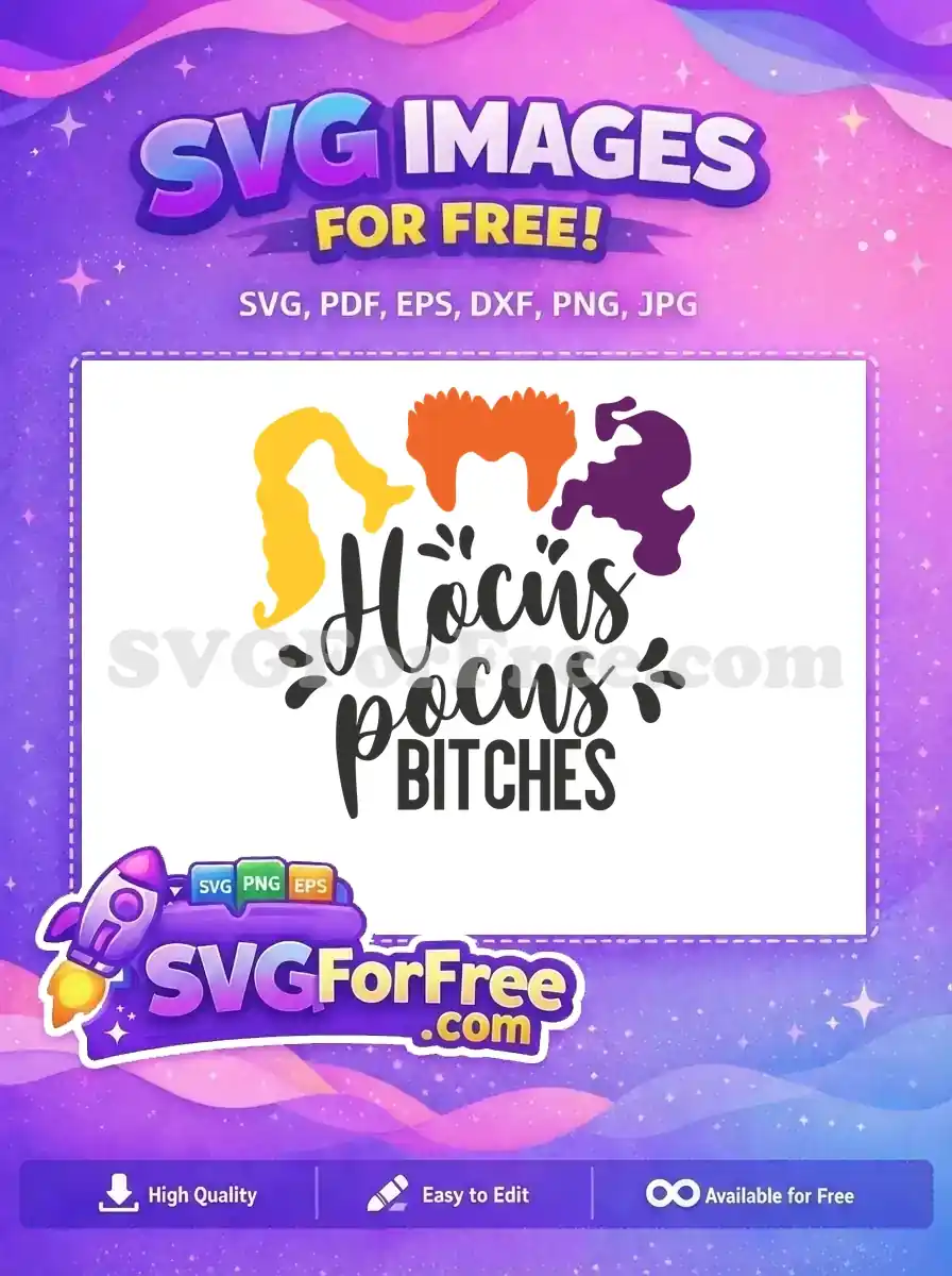 Sassy ‘Hocus Pocus Bitches’ text, a free bold design for adults who love witches and attitude.