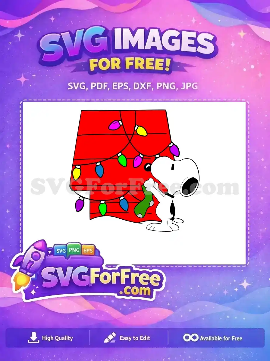 This free SVG features Snoopy decorating a doghouse with colorful Christmas lights, perfect for the holidays.