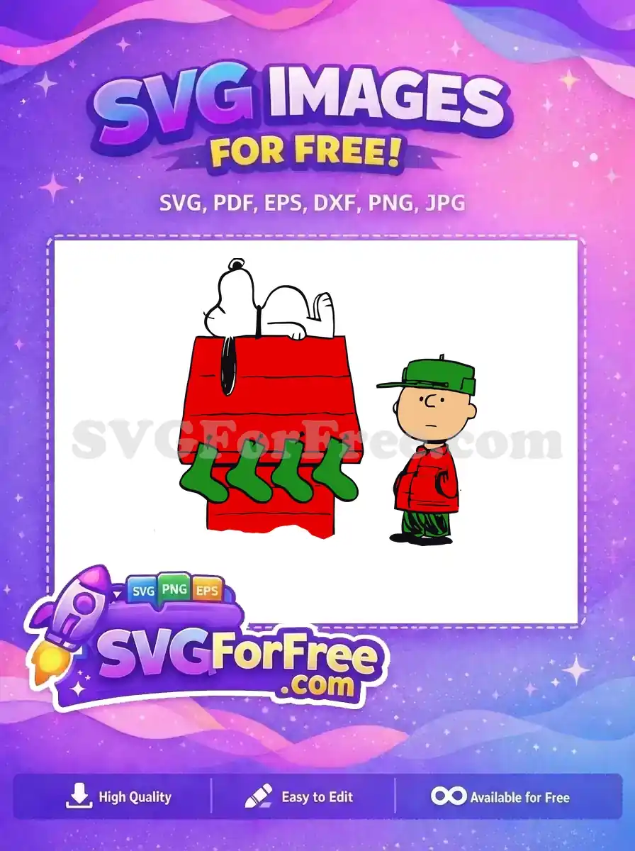 This free SVG design features iconic Peanuts characters, Snoopy and Charlie Brown, celebrating Christmas with stockings.