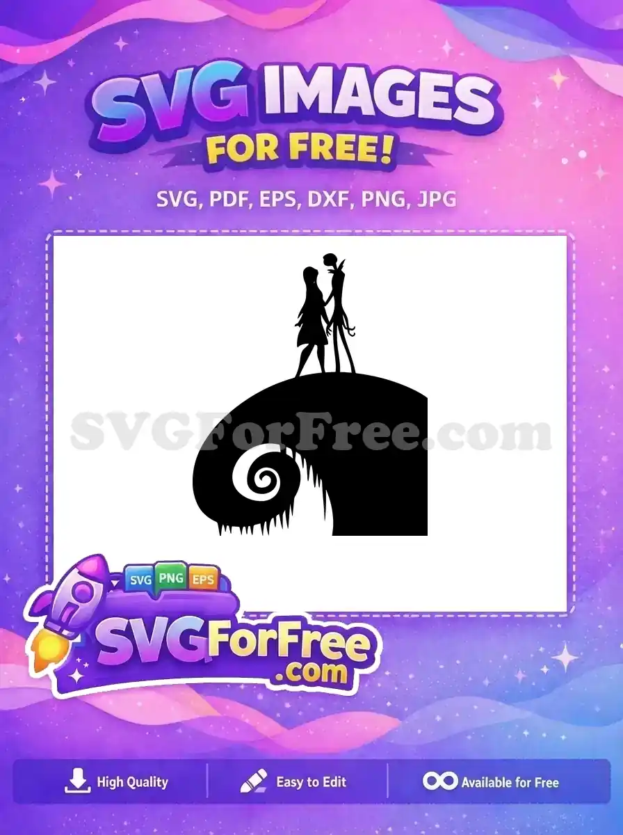 A simple silhouette of Jack and Sally standing close together on the iconic Spiral Hill. Free design.
