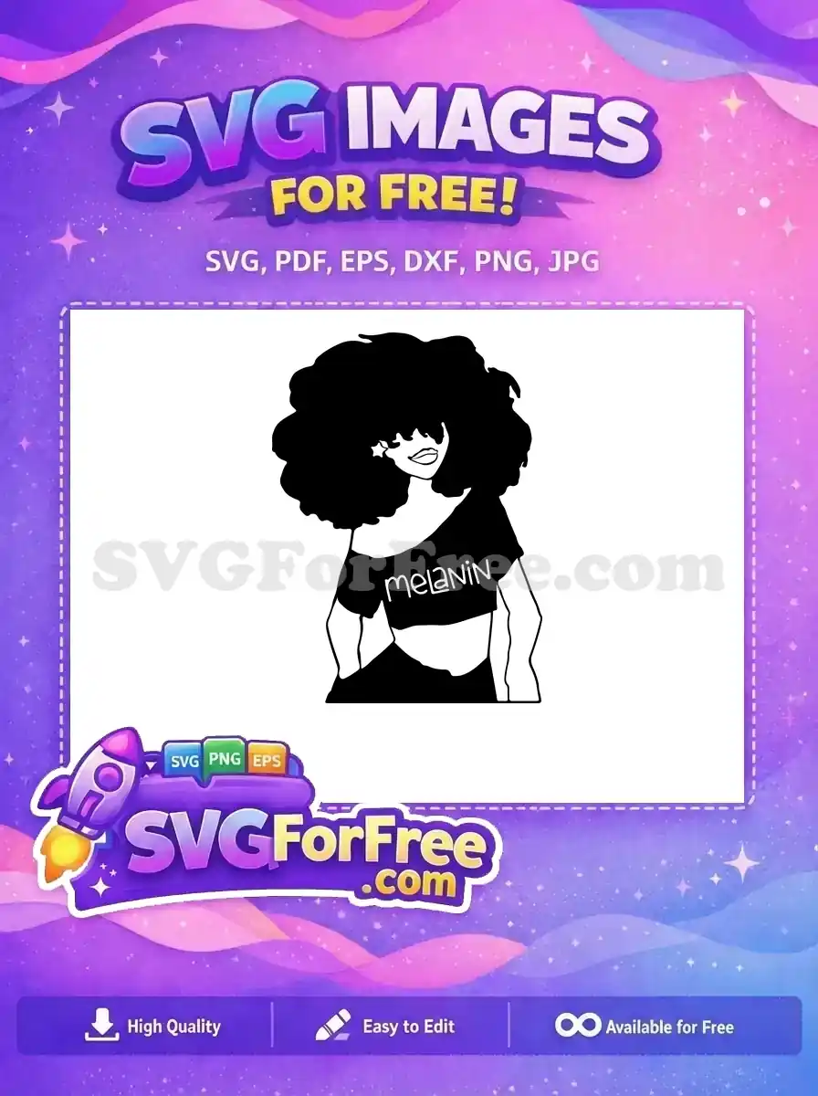 A free graphic of a confident woman with a big afro wearing a t-shirt that proudly says “Melanin.”