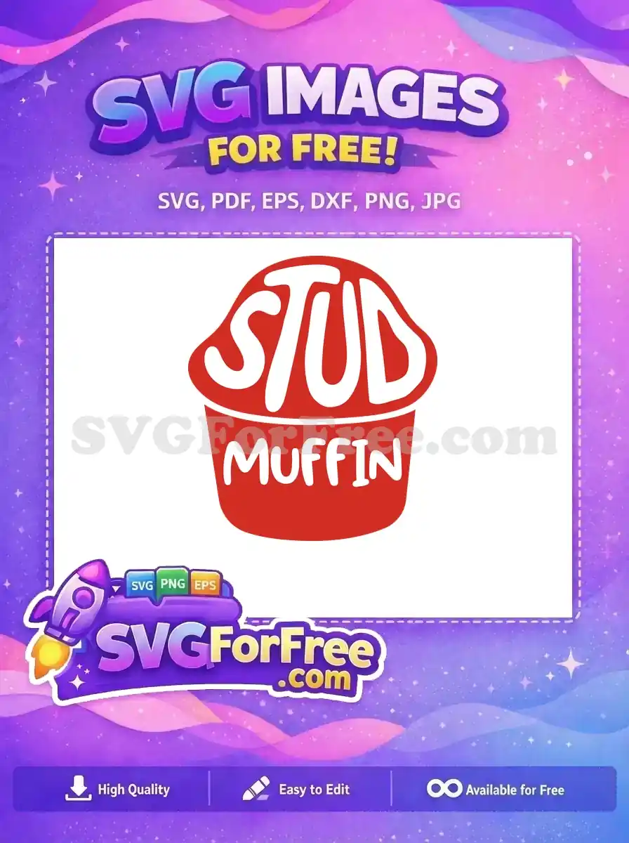 A funny and free graphic of a cartoon muffin with a red wrapper that says ‘STUD MUFFIN’ in bold text.