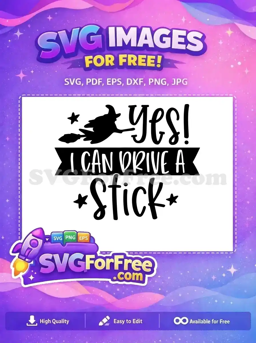 Humorous quote ‘Yes I Can Drive A Stick’ with a broom, a free design for funny witch-themed crafts.