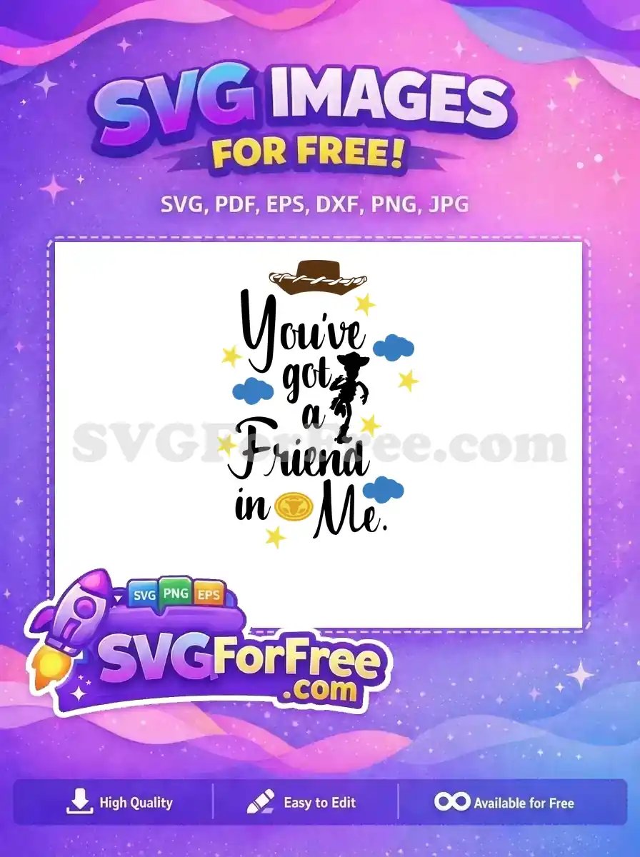 ‘You’ve got a Friend in Me’ text with Woody’s brown hat icon and a trail of gold and blue stars, complimentary vector.